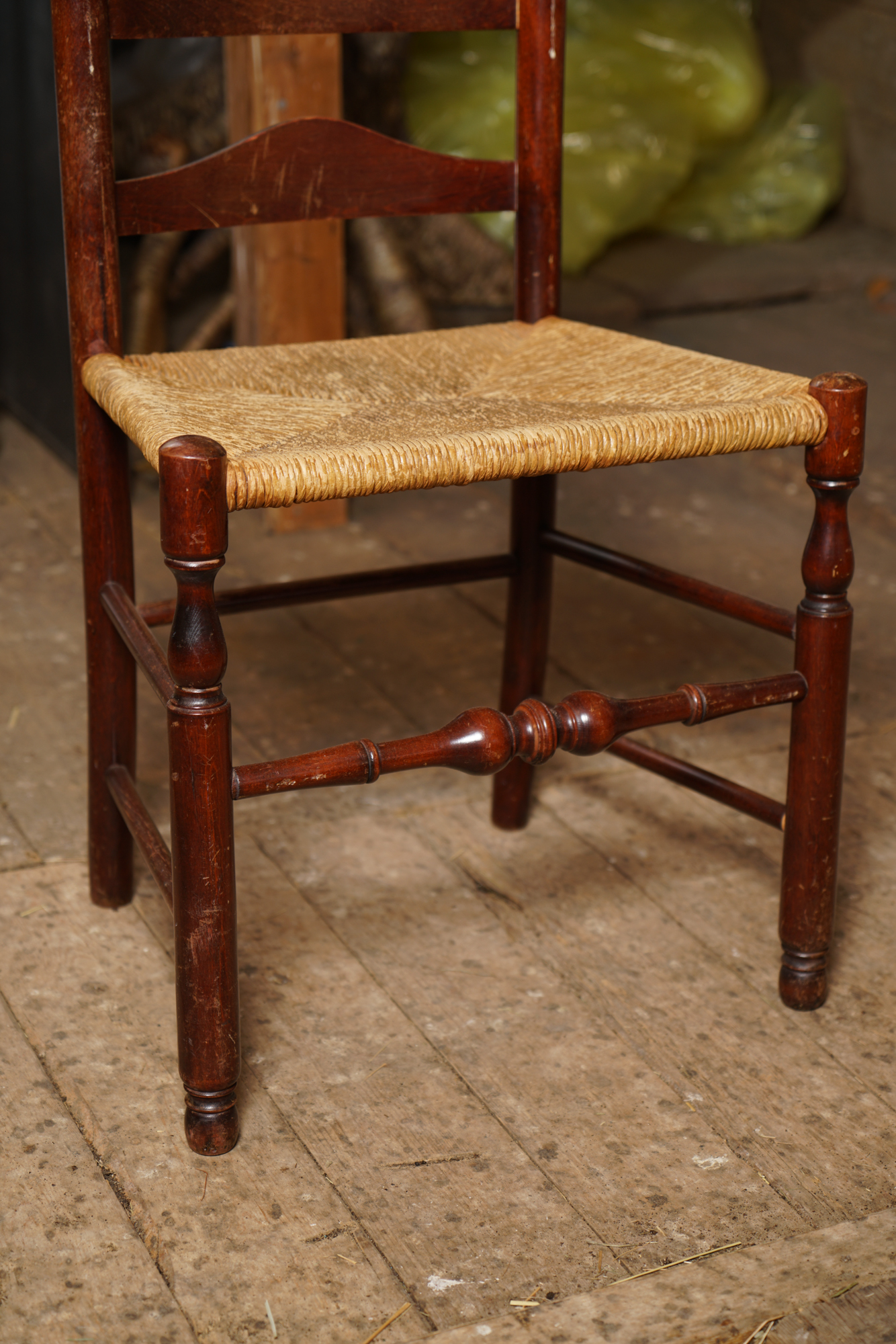 Ladderback chair with rush seat, england, circa 1730 classic farmhouse form with original seat. These ladder back rush seat chairs combine classic style with practical comfort and functionality. Some of these are even inflatables and provide children with an added sense of fun. One of the chairs is for an adult, and is made of varnished pine. The four chairs are #solidwood with rush seats and tapered finials.